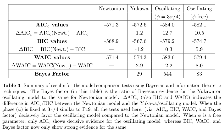 An example of applying Bayesian methods to perform model comparisons is “Model comparison tests of modified gravity from the Eöt-Wash experiment” by Krishak and Desai. They re-examine the claim in “Hints of Modified Gravity in Cosmos and in the Lab?”” by Perivolaropoulos and Kazantzidis, made using frequentist methods, that there is evidence in the data of the Eöt-Wash experiment that looks for modifications of Newton’s Law of Gravity on sub-millimeter scales for a residual spatially oscillating signal in the data. This could point to a modification of general relativity (in particular, of some type of nonlocal gravity theory) or it could be due to statistical or systematic uncertainties in the data.