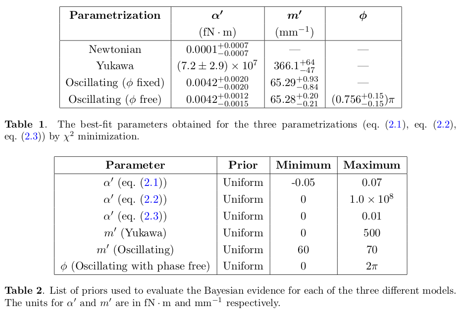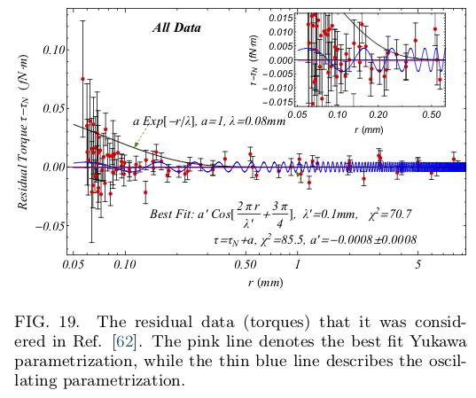 \[\begin{split}\begin{align} \delta\tau_1(\alpha',m',r) &= \alpha' \qquad \text{offset Newtonian potential} \\ \delta\tau_2(\alpha',m',r) &= \alpha' e^{-m'r} \\ \delta\tau_3(\alpha',m',r) &= \alpha' \cos(m'r + \phi) \end{align}\end{split}\]Figures of the data and some fits from figures in the two papers are shown here.