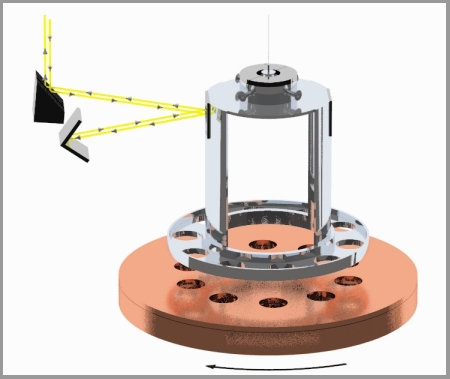 From https://www.npl.washington.edu/eotwash/inverse-square-law: “Below is a cartoon of one of our initial experimental devices which illustrates the technique we employ to measure gravity at short length scales. The pendulum ring, with 10 small holes bored into it, hangs by a thin tungsten fiber (typically 20 microns thick) and acts as the detector mass. The rotating plate just below it, with 10 similar holes bored into it, acts as the drive mass providing gravitational pull on the pendulum that twists it back and forth 10 times for every revolution of the plate. The pendulum twist is measured by shining a laser beam off of a mirror mounted above the ring. The induced twist (torque) on the pendulum at varying separation distances is then compared to a detailed Newtonian calculation of the system. For many of our measurements, the rotating attractor situated just below the detector ring actually consists of 2 disks. The upper disk has holes identical to those in the detector ring. The lower, thicker attractor disk also has a similar hole pattern bored into it, but these larger holes are rotated compared to those in the upper disk, so that they lie halfway between the holes in the upper disk. If the inverse-square law is correct, the lower holes are designed such that they produce a twist on the ring that just cancels the twist induced by the upper disk. However, if gravity changes strength at short distances as the theories suggest, the twist induced by the lower disk, which is farther from the ring, will no longer cancel the twist from the upper disk and we will see a clear twist signal. The actual situation is a bit more complicated; for ordinary gravity the cancellation is exact only for one particular separation between the ring and the attractor, but the variation of the magnitude of the twist with changing separation between the ring and the disks provides a clear ‘signature’ for any new gravitational or other short-range phenomena.”
