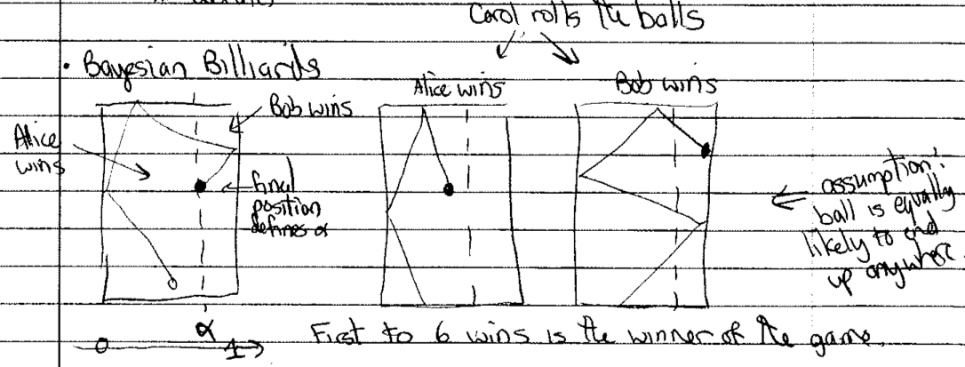 On a hidden billiard table (i.e., Alice and Bob can’t see it), Carol has randomly established \(\alpha\), which is the fraction of the table (\(0 \leq \alpha \leq 1\)) that defines whether Alice or Bob wins the roll. Alice gains a point if the ball ends up less than \(\alpha\), otherwise Bob gains a point. The first to six wins the game.