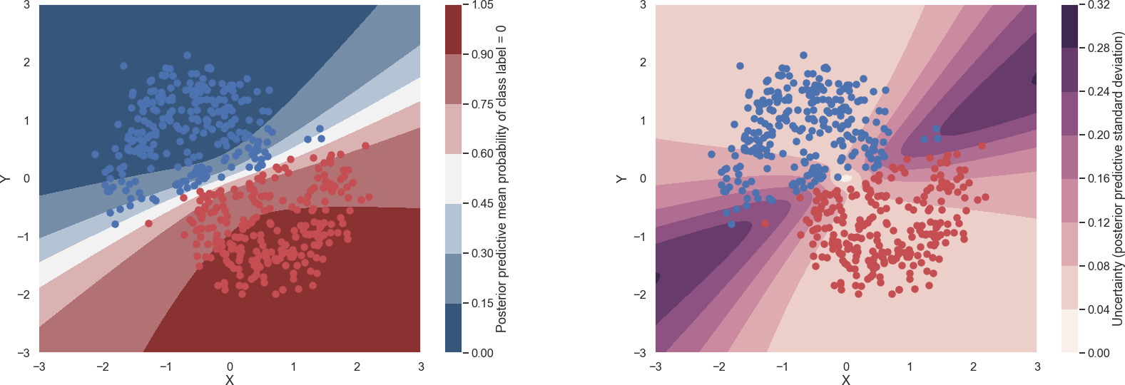 The predictions for a Bayesian binary classifier that has been learning using ADVI implemented in pymc3. The mean (left panel) and standard deviation (right panel) of the binary classifier's label predictions are shown.