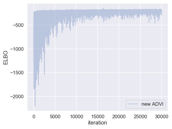 The training of the Bayesian binary classifier, that employs ADVI implemented in pymc3, corresponds to modifying the variational distribution's hyperparameters in order to maximize the Evidence Lower Bound (ELBO).